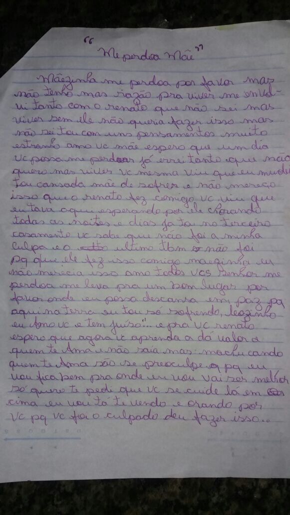 Antes de cometer o suicídio a jovem escreveu uma carta explicando os motivos que levaram ela a tirar a própria vida e pede perdão a mãe "Me Perdoa Mãe" .
